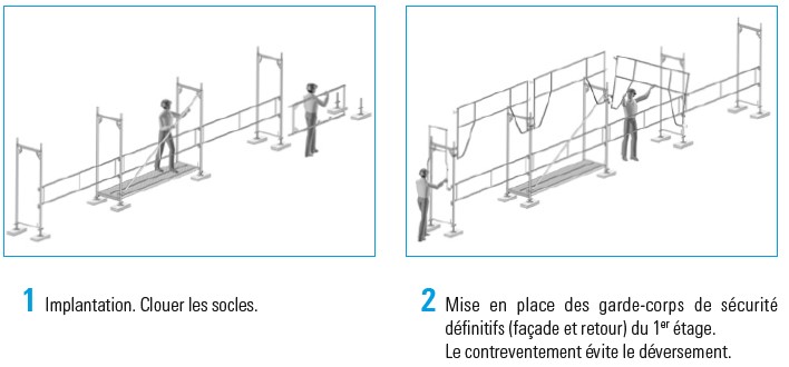 - Il y a lieu d’utiliser en priorité les matériels préfabriqués dont les garde-corps sont mis en place à partir du niveau inférieur déjà exécuté et protégé, avant la mise en place du plancher supérieur,